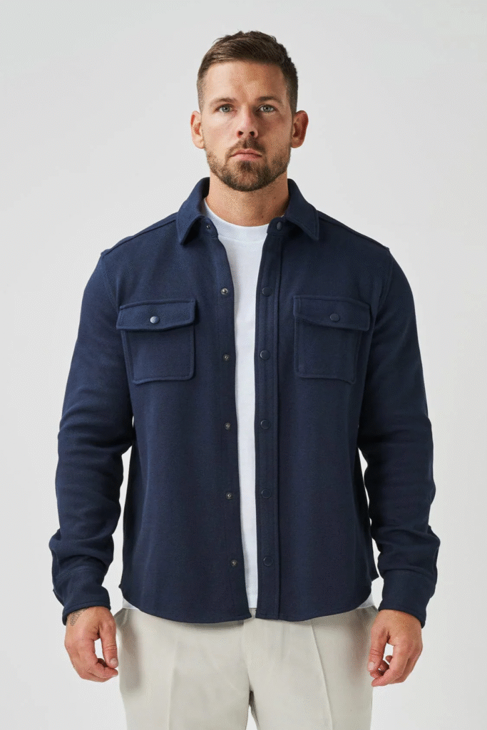 An overshirt is a versatile piece that bridges the gap between casual and formal attire. It can be worn over a plain white crew-neck tee, paired with jeans and chinos, or even under a navy suit.